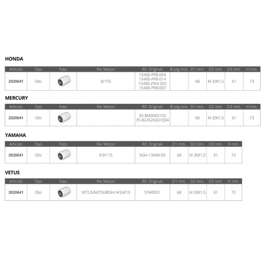 Filtro olio per motori fuoribordo HONDA, MERCURY, YAMAHA, VETUS.