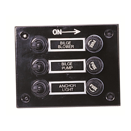 Pannello elettrico in ABS nero, con interruttori a leva protetti da cappuccio in gomma e portafusibili completi di fusibili in vetro da 5 AMP (6,3×32),