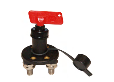 Stacca batteria unipolare in policarbonato nero con flangia Ø 60 mm, chiave estraibile, contatti in rame Ø 9,4 mm.